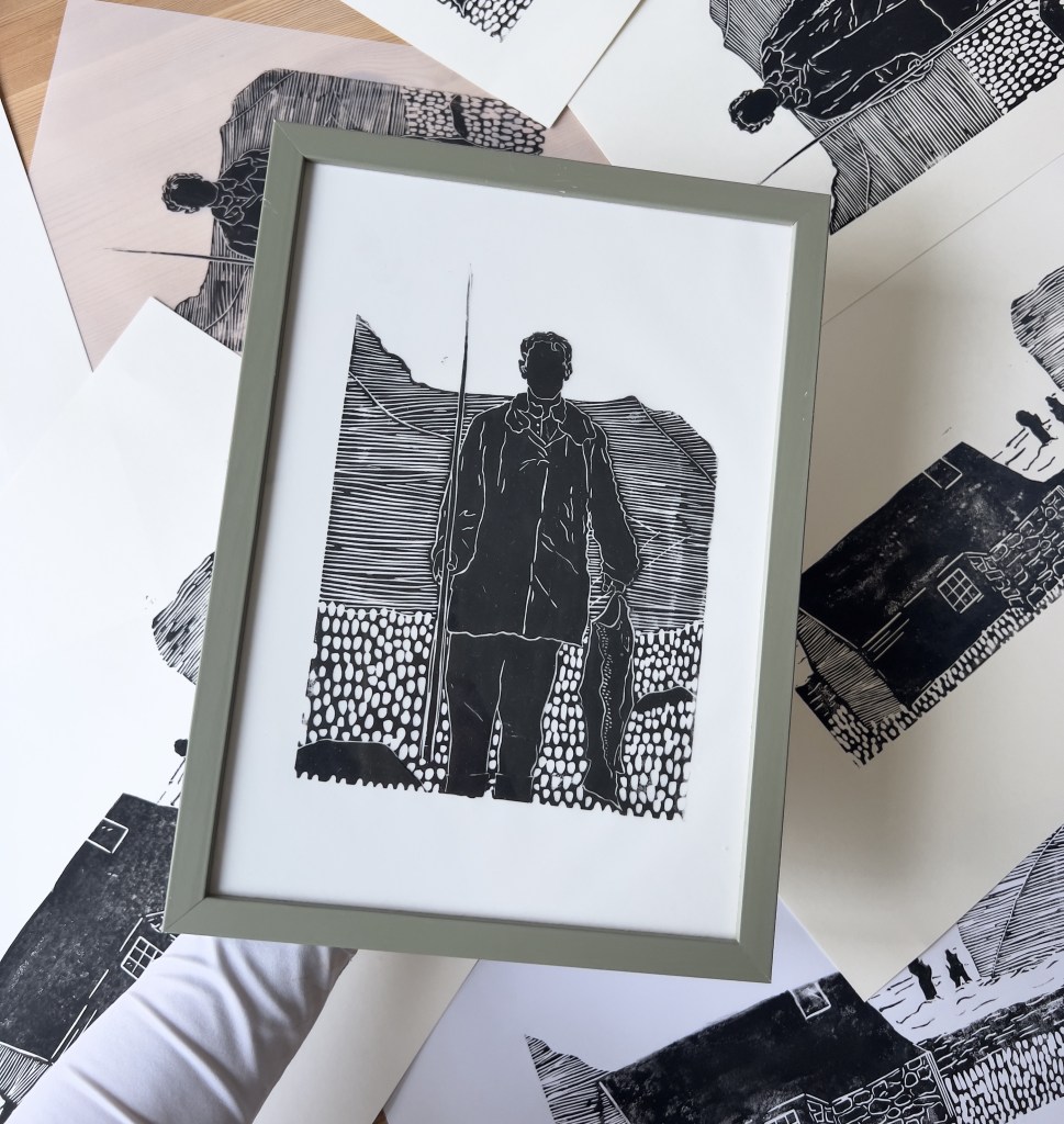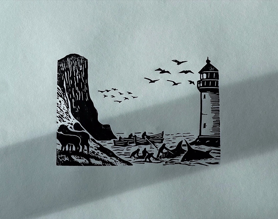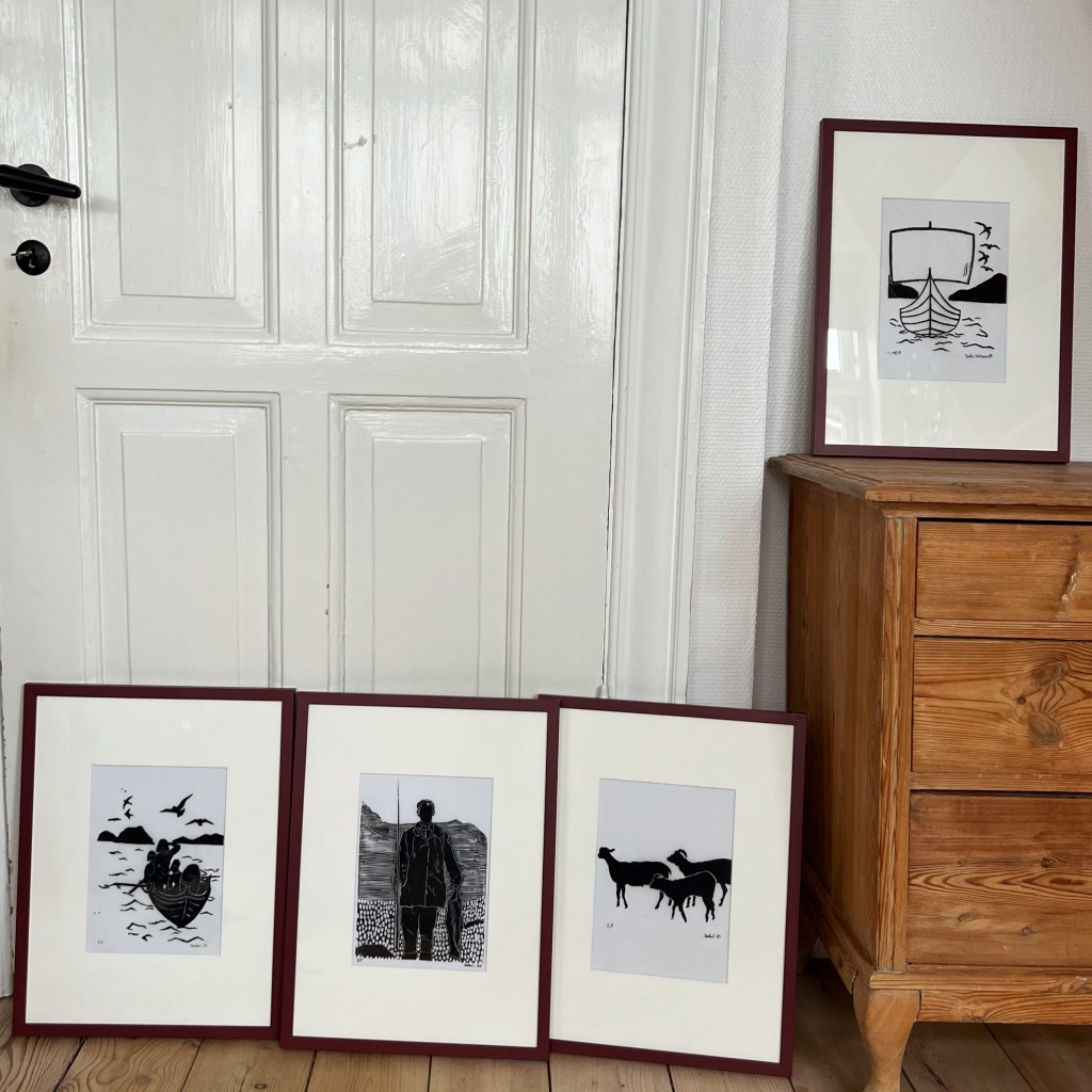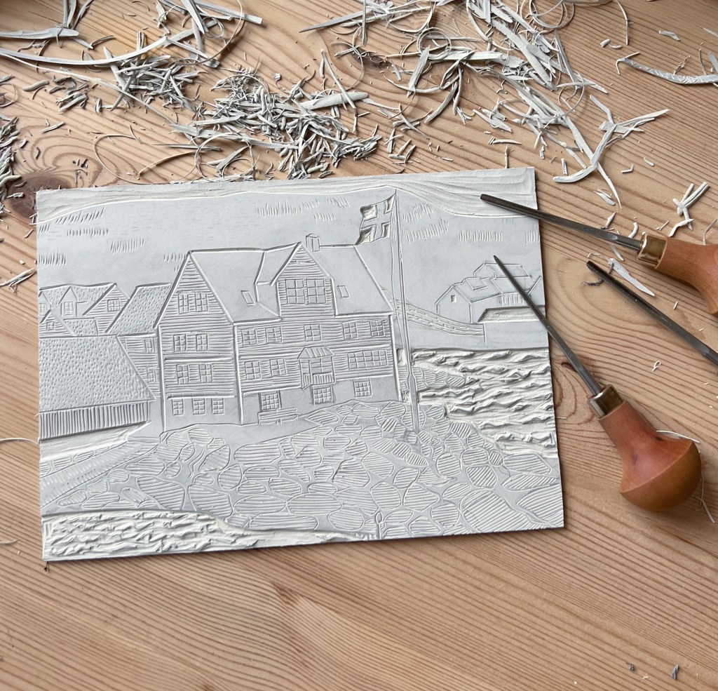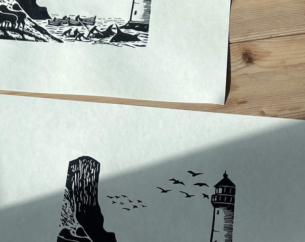Hvørt prent byrjar sum ein fløt, grá linoleumpláta. Við hondini skerast mynstur, linjur og smáar detaljur, sum vaksa til eitt myndamál av myrkri og ljósi. Tá plátan er smurd við liti og prentað á pappír, fær hon lív.