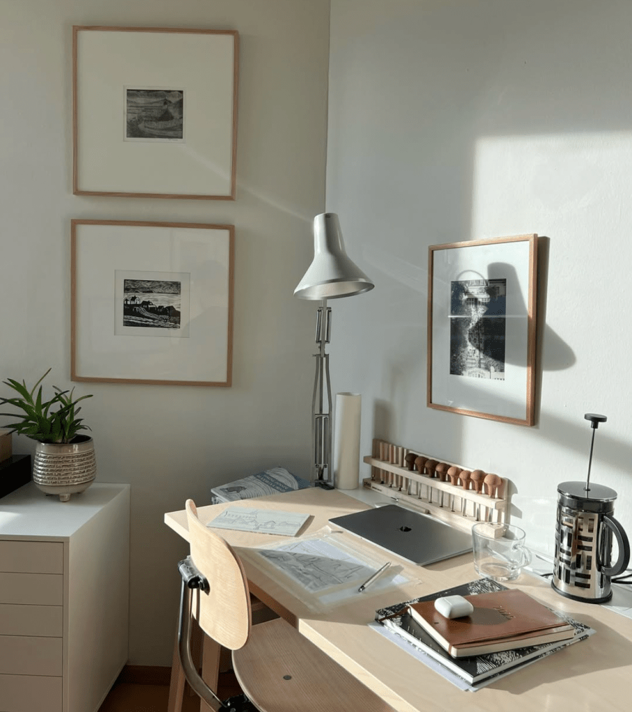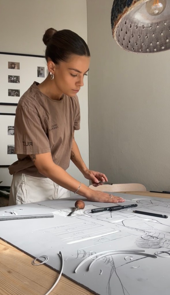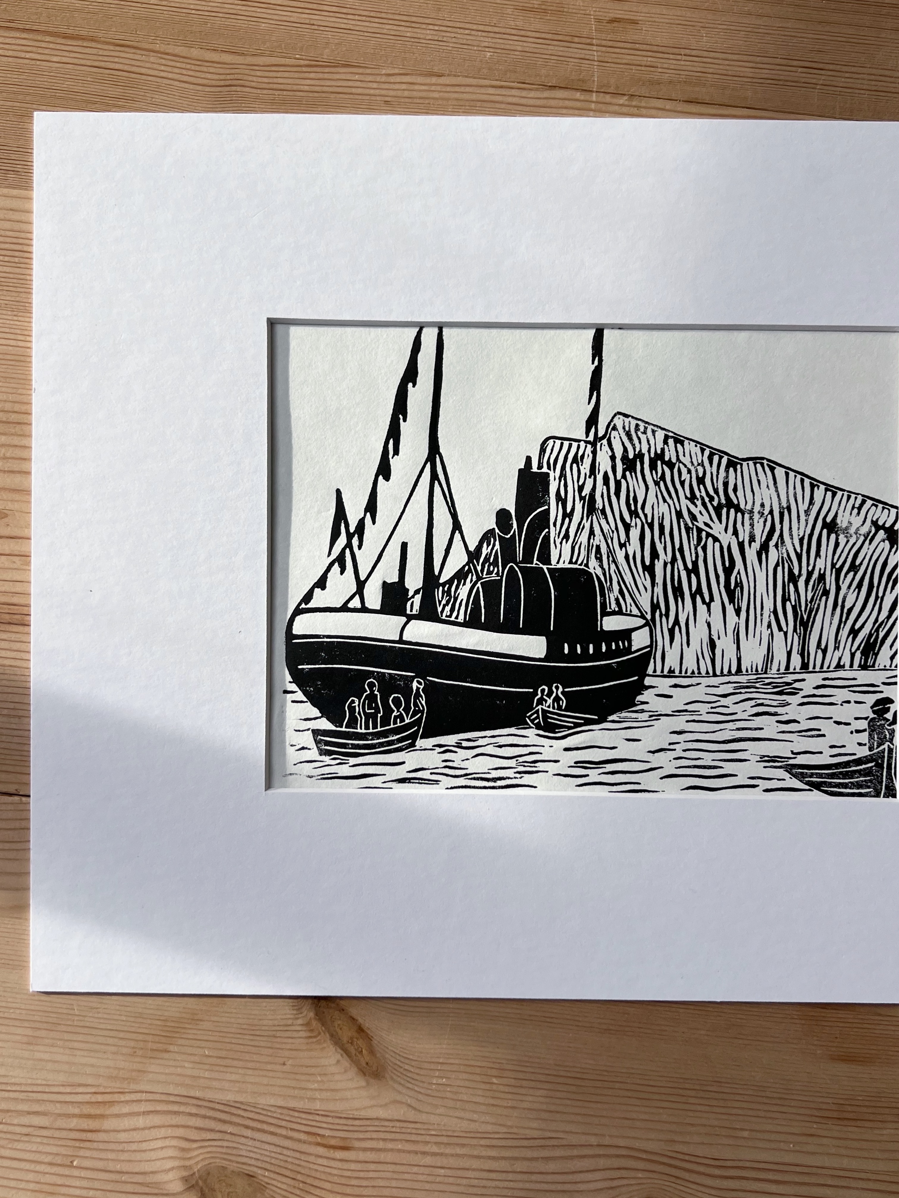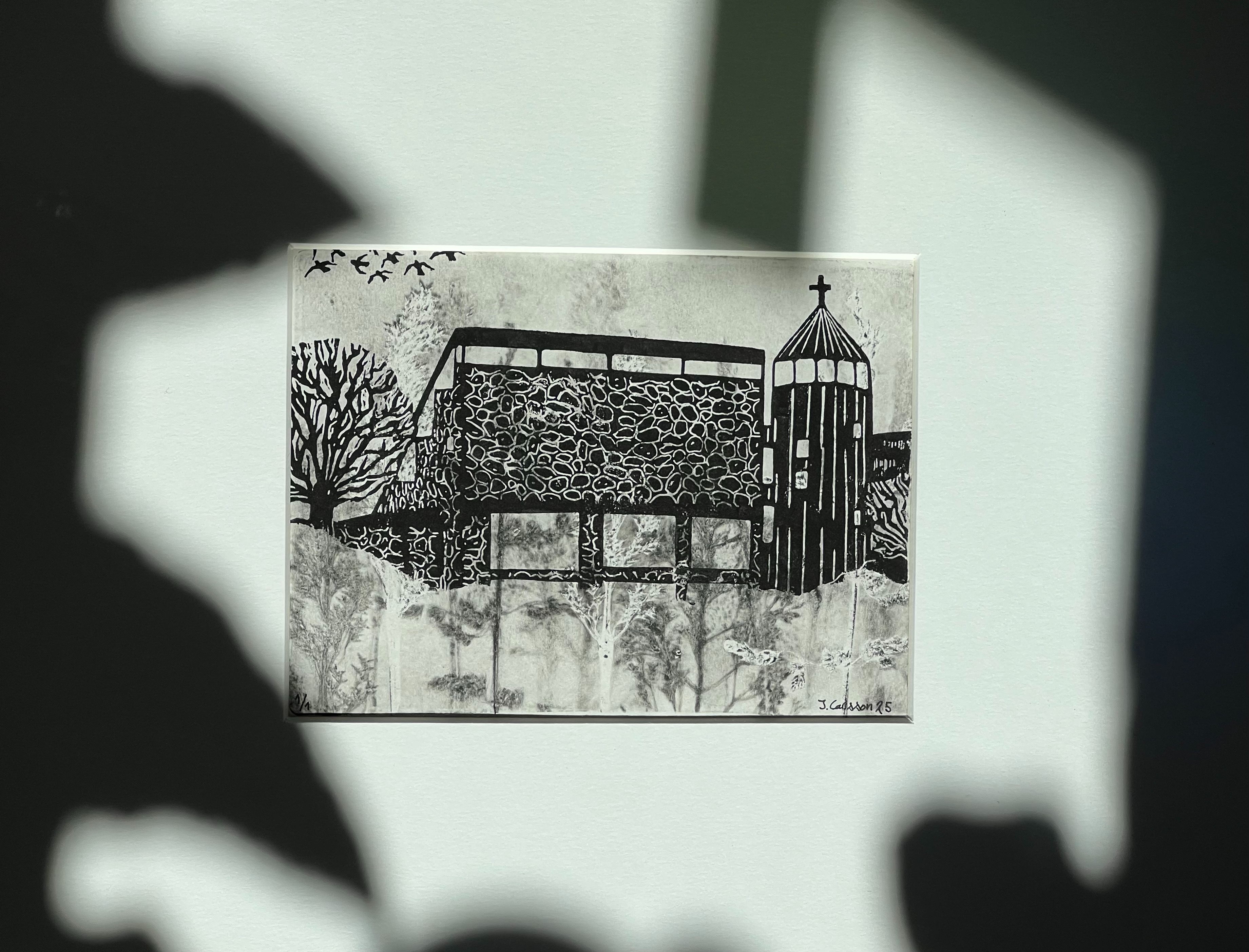 Hvørt prent byrjar sum ein fløt, grá linoleumpláta. Við hondini skerast mynstur, linjur og smáar detaljur, sum vaksa til eitt myndamál av myrkri og ljósi. Tá plátan er smurd við liti og prentað á pappír, fær hon lív.